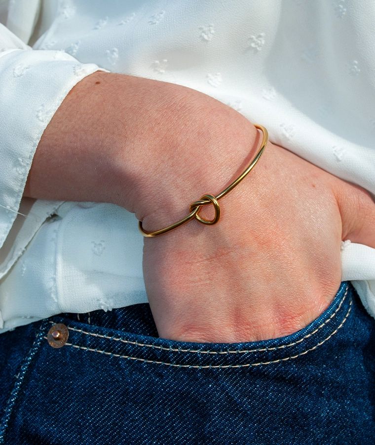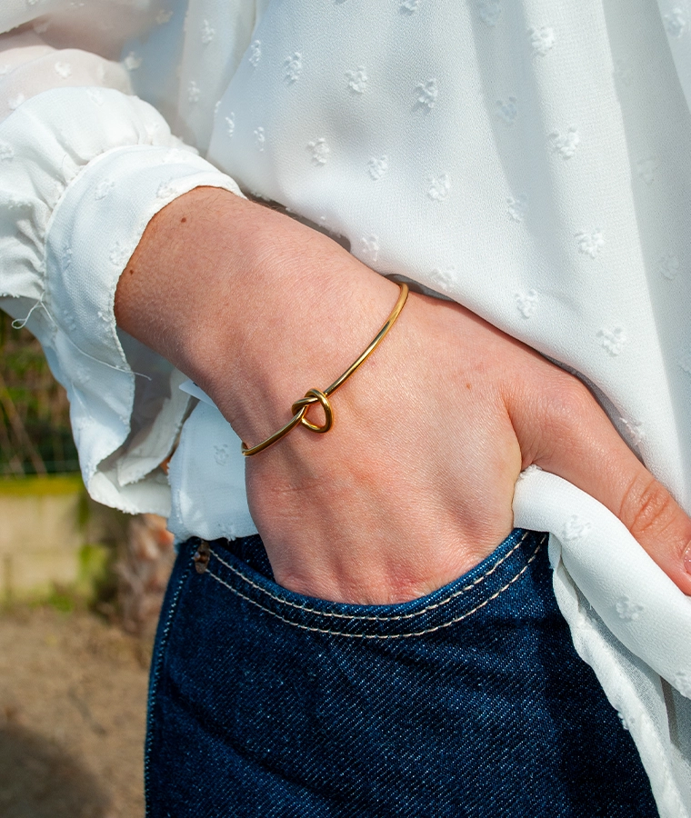 Le bracelet jonc Kardia est en acier inoxydable doré et ajustable car il n’est pas fermé à l’arrière