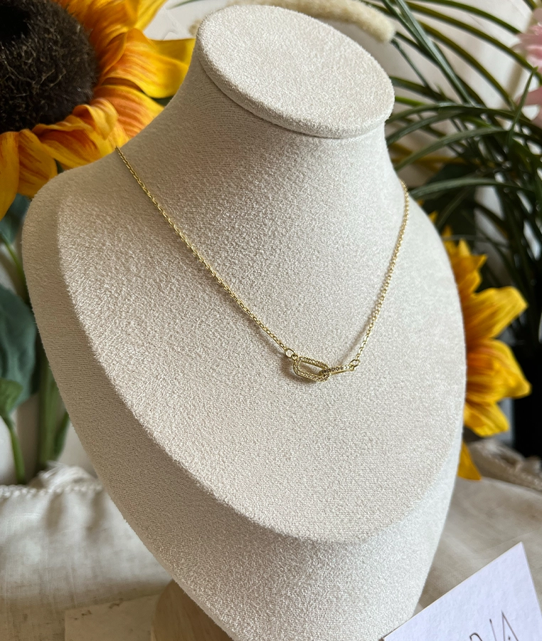 Le collier Milos séduit par son élégance discrète et son éclat raffiné. Composé d’une fine chaîne en acier inoxydable doré, il est orné d’un lien délicatement pavé de zircons, symbole de connexion et d’équilibre.